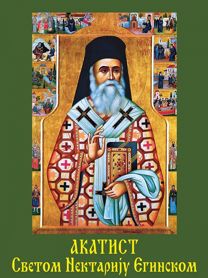 О святой Нектарий, богомудрый отец! Прими, хранитель православной веры, исповедание уст народа Христова, собравшегося сегодня в храме благодатью Божией, живущей в тебе. До земли Сербии дошла весть о том, что ты, великий среди святых, угождающий Богу, являешься во всех уголках мира призывающим имя твое и исцеляешь больных от рака. Мы слышали о священнике, твоем тезке, Нектарии, который строит храм во имя твое, с великими страданиями, потому что тяжело болел раком грудной клетки, из раны его текла кровь каждый день, и он сильно страдал, но не оставил своего святого дела. И ты, святой многомилостивый, внезапно сошел с неба и явился ему в храме. Однако он, думая о тебе как о брате и одном из смертных, попросил тебя помолиться за него и сказал: «Я очень болен, но хочу построить святую церковь, чтобы хотя бы раз вместе с прихожанами совершить в ней Святую Литургию, а потом пусть умрёт, ибо не боюсь смерти». И ты, отец, хотя и был бестелесен, омыл лицо своё слезами! Обняв страдальца, ты поцеловал его и сказал: «Не скорби, дитя моё, ибо, будучи искушаем болезнью, ты скоро выздоровеешь. И все узнают об этом чуде». Последний же, исцелившись, понял, с кем говорит, но ты к тому времени уже стал невидим. О великий угождающий Христу, Нектарий! Этот храм сегодня достроен, и твои чудеса умножились, как море! Мы поняли, что молитвы праведников должны подкрепляться нашим рвением к служению Богу и нашей решимостью умереть за Христа, чтобы исцелиться. Больные дети Твои, праведный отец, молитесь Тебе: да исполнится в нас благая, угодная и совершенная воля Божия, ибо Бог не желает смерти грешника, но чтобы грешник обратился и жил. А Ты, пророк воли Божией, исцели нас Своим благодатным явлением, да будет велик Бог на небе и на земле во веки веков! Аминь.