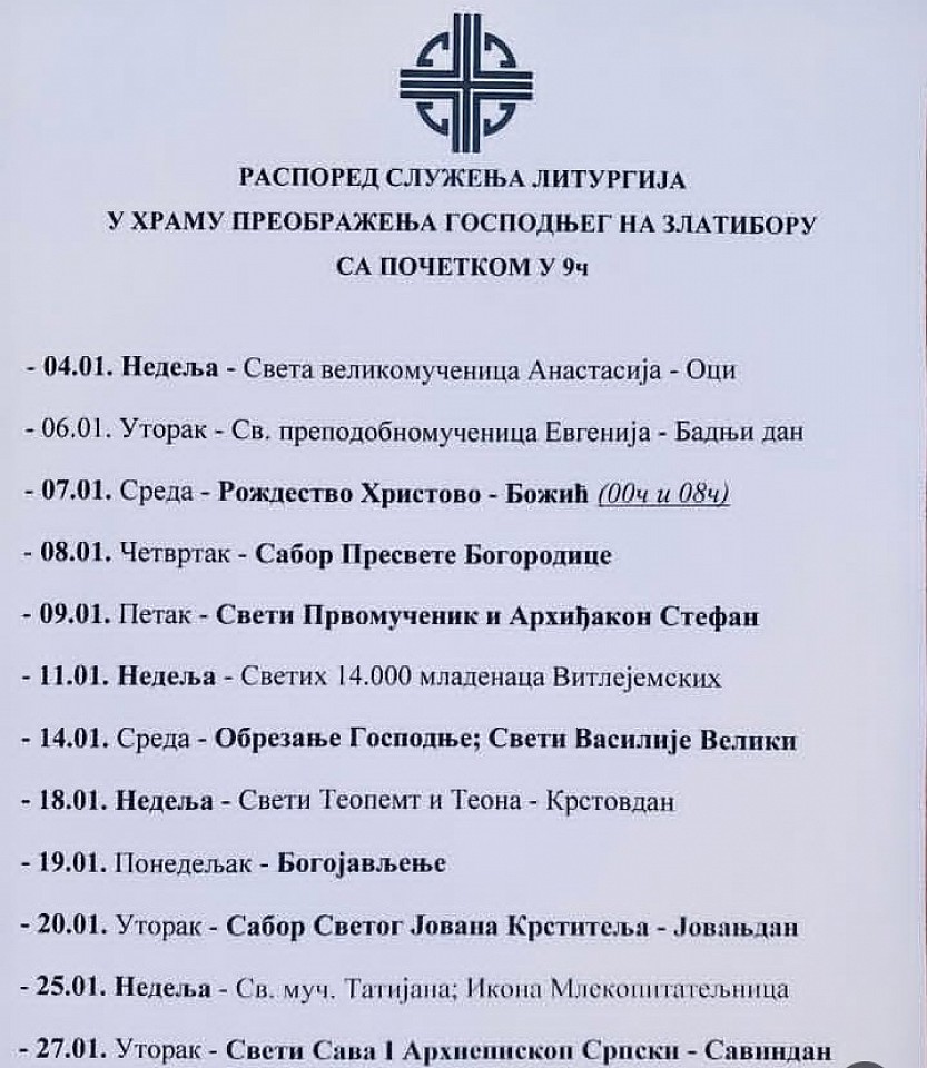 Расписание Священной Литургии в храме Преображения Господня в Златиборе на январь 2026 года.